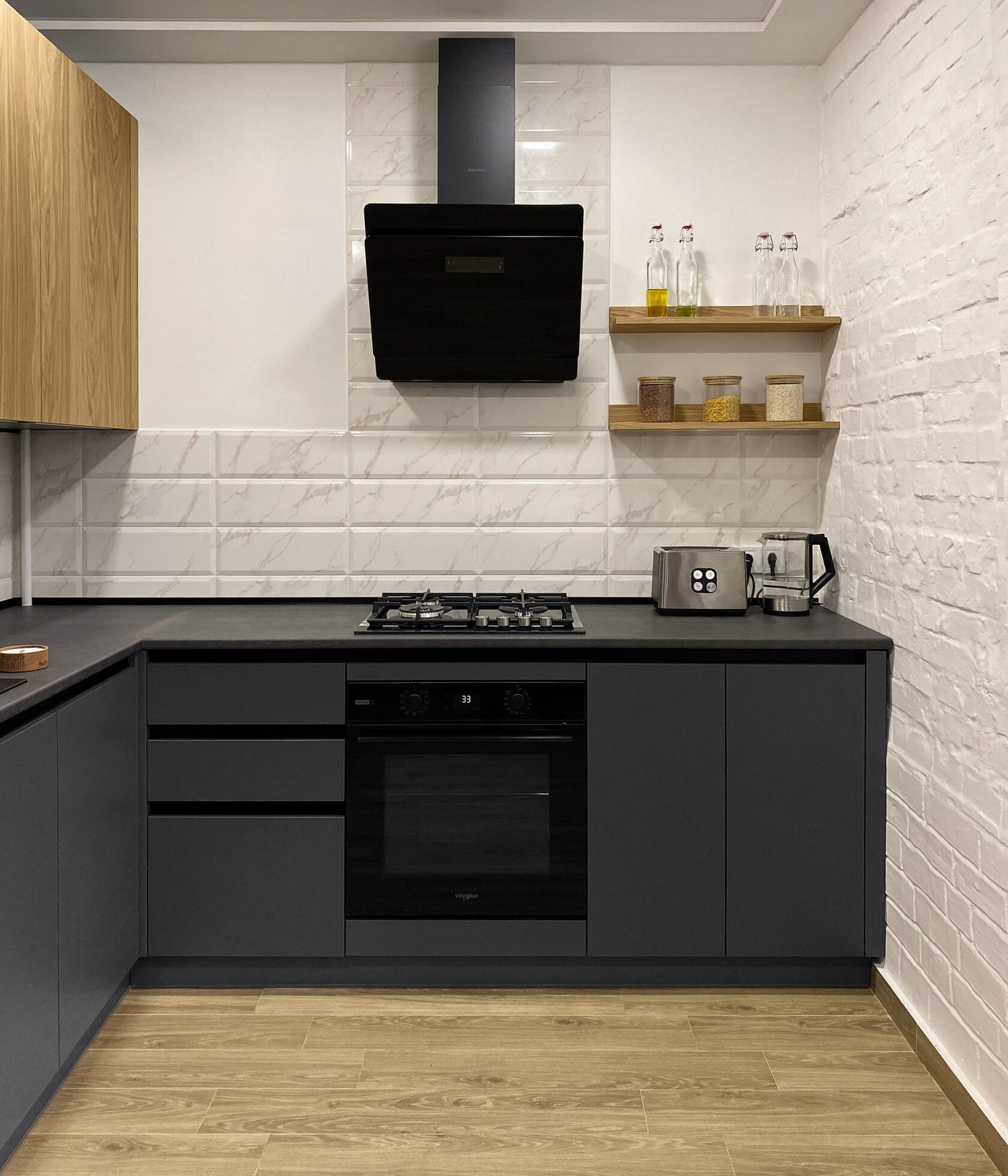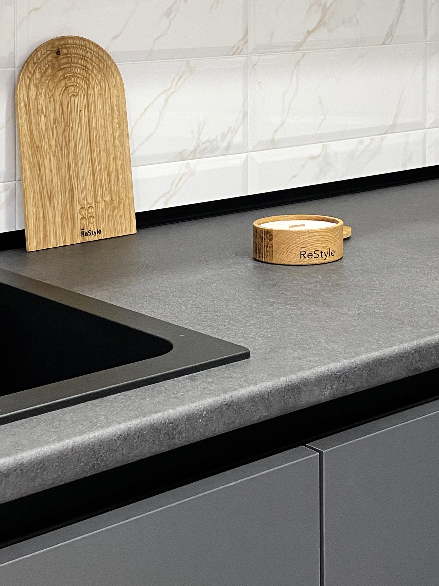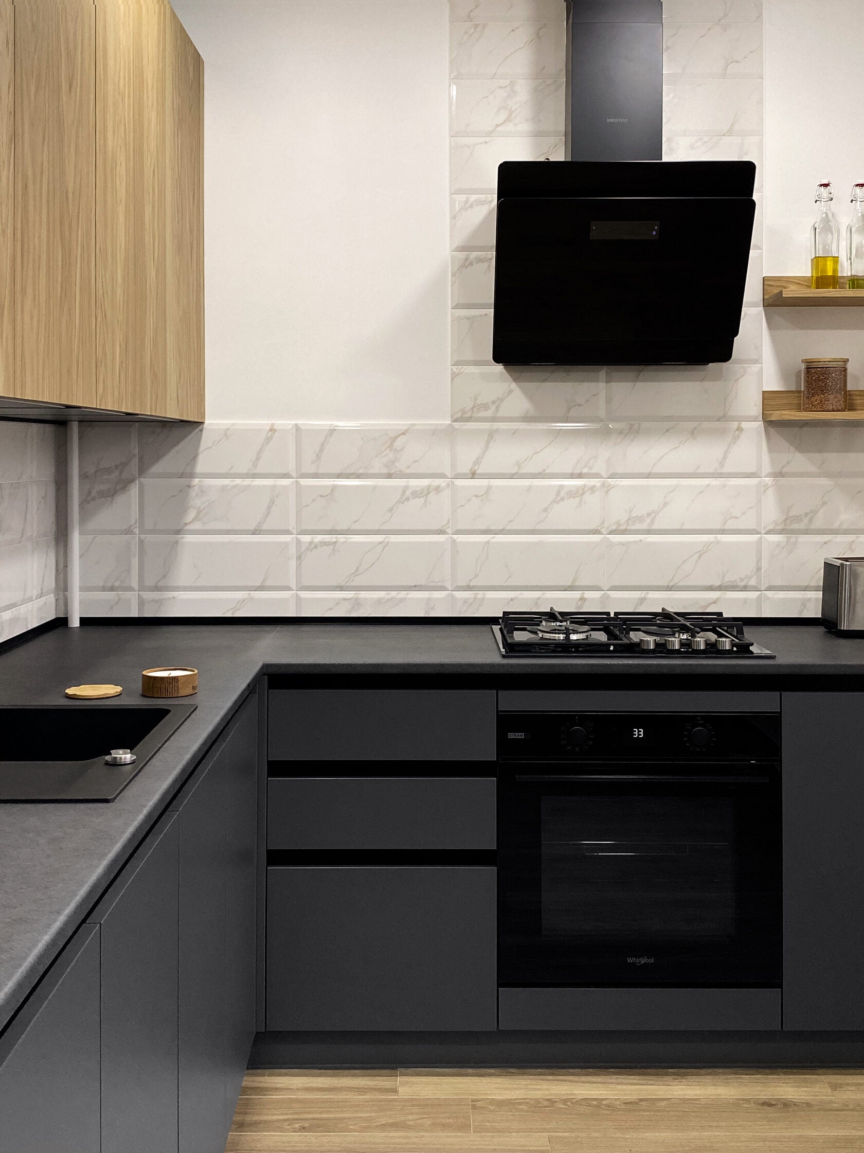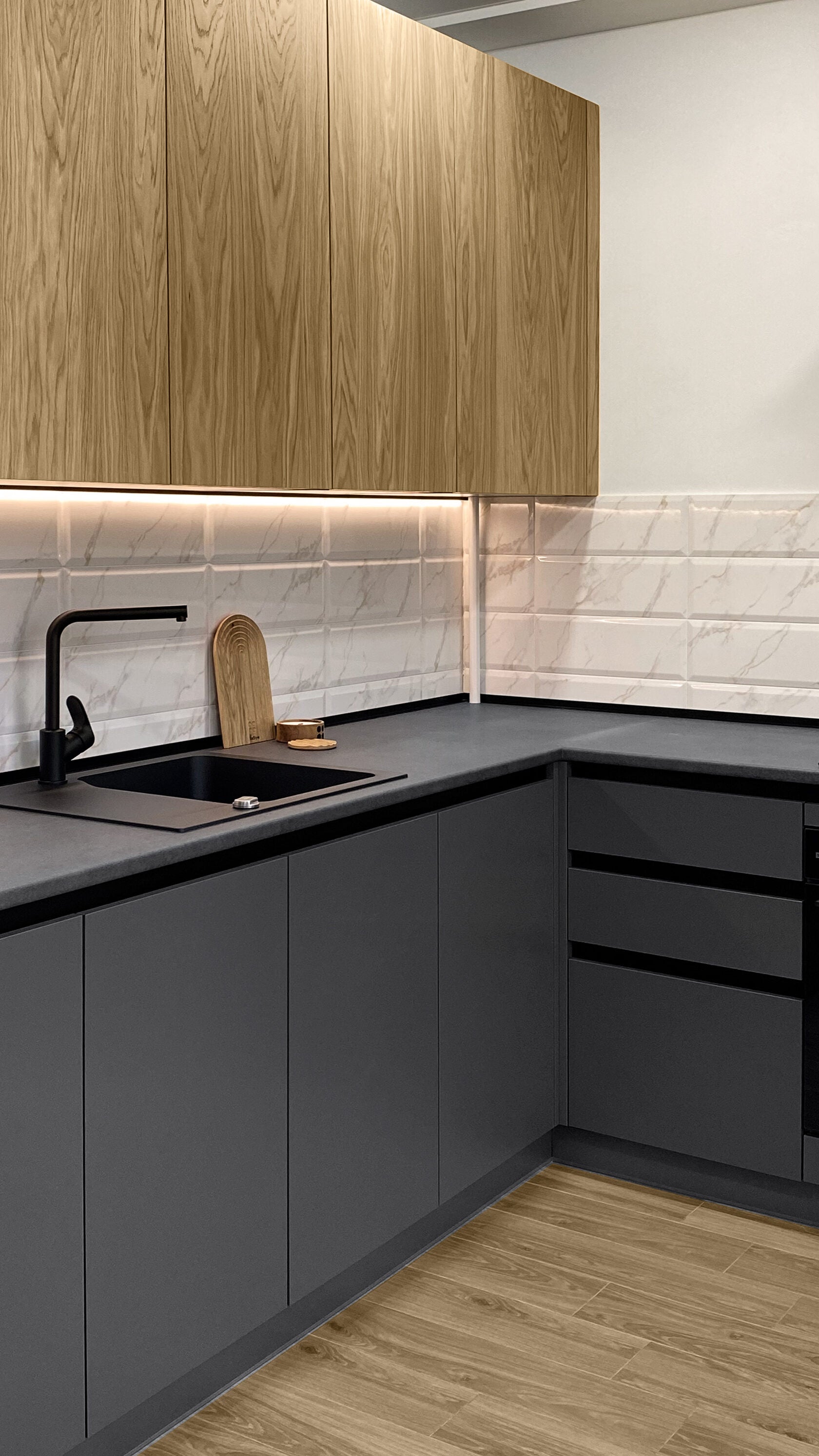Facade material: Wood natural oak Laminate graphite