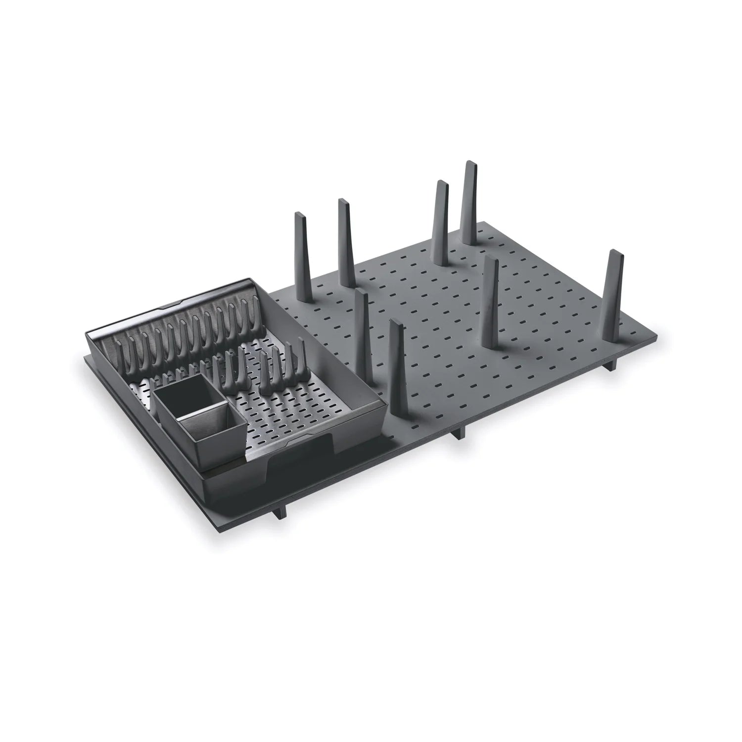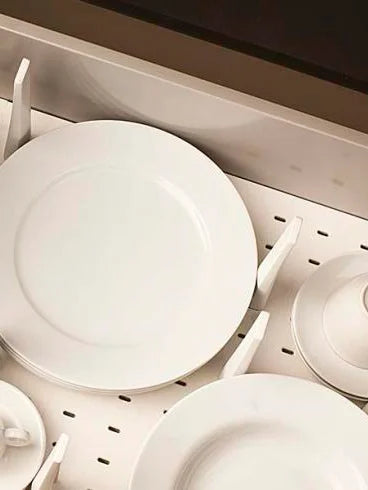 Tray and dividers for plates that is installed in a drawer with a width of 600 or 900 mm. The base is a perforated bottom, material - ash, color - gray. In addition to the bottom, the sets include dividers for plates that can be individually placed in the holes or a combination: dividers and a removable tray for dishes.
